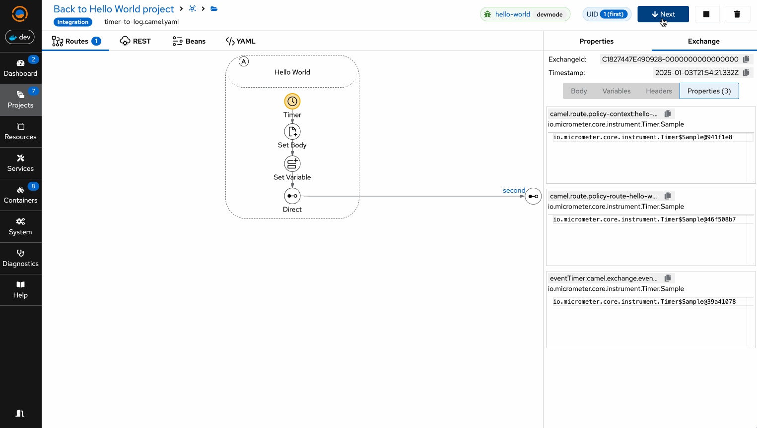 - Dashboard: Containers, JVM, CamelContext, Routes